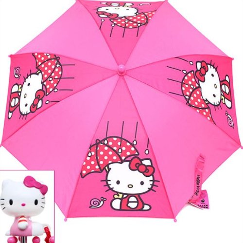 Hello Kitty Kid Sized Umbrella is made of 100% polyester so the rain rolls right off. This umbrella has a special 3D handle that measures 3"L. The umbrella measures 21" long and 32" across the top when opened.